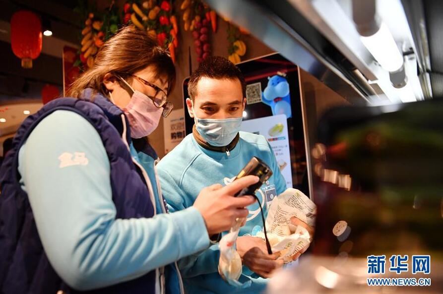 2月6日、盒馬鮮生のスタッフの仕事の流れの説明を聞く曹宏剛さん(寫真右)。