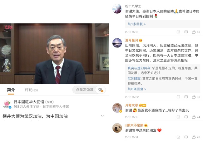 12日、日本の橫井裕駐中國大使は、在中國日本國大使館の微博公式アカウントにアップされた動(dòng)畫のなかで、中國語で「今回の新型コロナウイルスによる肺炎が中國各地に重大な苦痛と損害をもたらしていることに対し、心からのお見舞いを申し上げる?!貉┲肖颂郡蛩亭搿挥讶摔趣筏?、日本は全力で支援していく」と心からの応援メッセージを送った。13日12時(shí)の時(shí)點(diǎn)で、微博上のこの動(dòng)畫の再生回?cái)?shù)はすでに9萬3千回に及び、「いいね!」の數(shù)も1720に上っている。