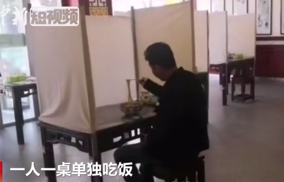 1本目は、甘粛省慶陽(yáng)市にあるラーメン店の動(dòng)畫で、テーブルとテーブルの間は約2メートルほど離され、各テーブルには1人しか座れない。さらに、飛沫感染を避けるために、全てのテーブルの三方が白い布で覆われている。ある客は「ここで食事をすると、科挙を受けているような気分になる」と感想を述べている。