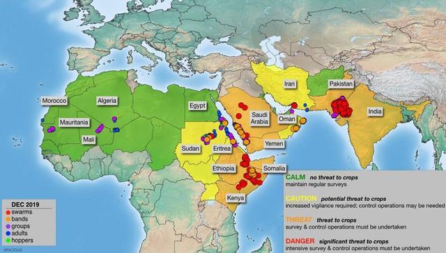 サバクトビバッタは昨年1月にアフリカのスーダンとエリトリアから紅海を飛び渡った。2月にはイエメン、サウジアラビア、イランに、3月にはパキスタン南西部に、6月にはパキスタン中部?北部に到達(dá)した。これらの國(guó)に深刻な危害を及ぼし、大群を作った。雨量が豊富で季節(jié)風(fēng)が吹く期間が長(zhǎng)いといった影響により、東アフリカ、西アジア、南アジア諸國(guó)は現(xiàn)在、史上稀に見る蝗害に見舞われている。ソマリア、パキスタンなどの國(guó)は緊急事態(tài)宣言を出し、蝗害に対処している。