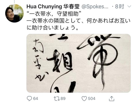 外交部の華春瑩報道官は17日夜、自らの英語版ツイッターアカウントに日本語で、「私たちは日本國內(nèi)の新型肺炎の感染狀況を注視し、日本の皆さんと同じ気持ちでいます。中國はウイルスとの戦いに取り組むと同時に、情報と経験を日本側(cè)と共有し、できる限りの支援を提供していきます。雙方はすでに関係分野における?yún)f(xié)力に著手しました」と投稿した。また「一衣帯水 守望相助」と筆で書いた畫像に「一衣帯水の隣國として、何かあればお互いに助け合いましょう」と日本語で説明を加えた。