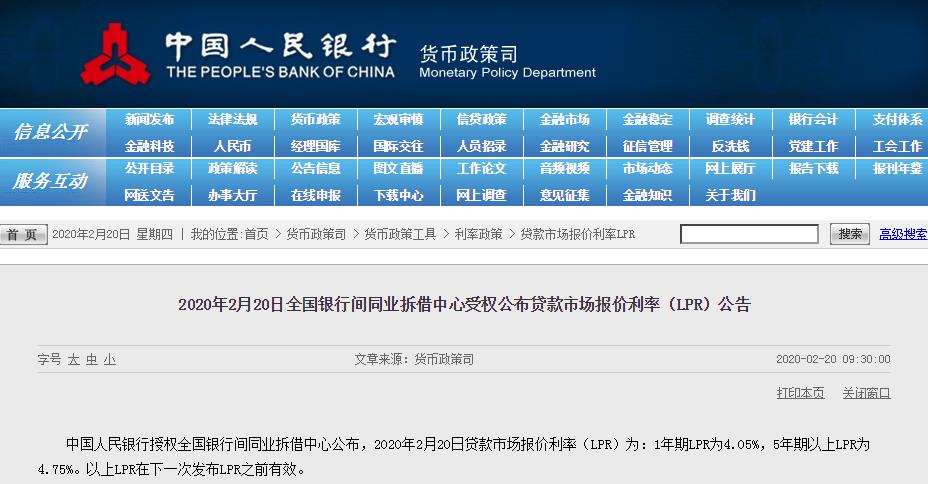 中國人民銀行(中央銀行)が権限を授與した全國銀行間資金調(diào)達センターが明らかにしたところによると、2020年2月20日に最優(yōu)遇貸出金利(LPR、ローンプライムレート)を調(diào)整し、1年物の金利を0.1ポイント引き下げて4.05%、5年超物は0.05ポイント引き下げて4.75%にした。中國新聞網(wǎng)アプリが20日に伝えた。(編集KS)