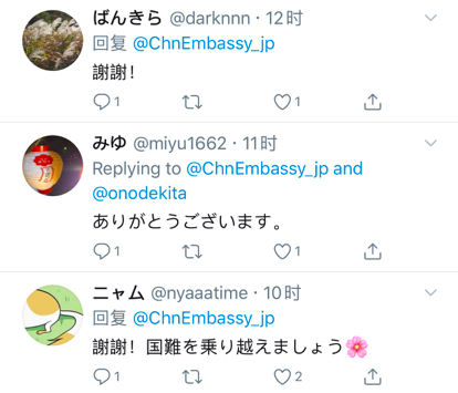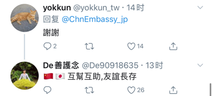 中國のネットユーザーから日本を応援する友好的なやり取りもあった。ある中國のネットユーザーは中國語で感謝した日本のネットユーザーのコメントに「互いに助け合いましょう 友情はとこしえに」と返信した。(編集NA)
