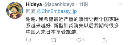 プロフィールで「中國に少し興味がある」としている日本のネットユーザーも「最近の深刻な事態(tài)を受けて、両國の結(jié)びつきが良いものになっていってほしい。新型肺炎が収束したら、多くの中國人が日本観光に來るのを楽しみにしている」とコメントした。