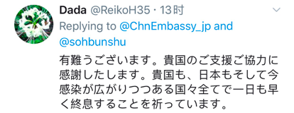 HSK4級に合格済みという日本のネットユーザーは「とても感謝します!協(xié)力してコロナウイルスを抑え込みましょう!」と中國語でコメントした。