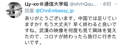 感謝だけでなく、「中國では足りていますか?もう大丈夫?早く終わると良いですね。武漢の映像を何度も見て興味を覚えたので、コロナが終わったら旅行に行きたいです」とのコメントもあった。