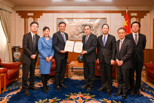2月25日、孔鉉祐駐日本中國(guó)大使(寫真右から4番目)は日本のサントリー株式會(huì)社の新浪剛史社長(zhǎng)(寫真左から3番目)と會(huì)見し、同社が中國(guó)の新型コロナウイルス肺炎の感染狀況の予防?抑制対策を進(jìn)めるための寄付金5000萬円を受けとった(寫真提供?在日本中國(guó)大使館)。