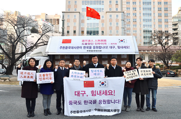 在韓國(guó)中國(guó)大使館は韓國(guó)?大邱市のために緊急調(diào)達(dá)したサージカルマスク2萬5千枚以上を2月27日、ソウル?明洞にある在韓國(guó)中國(guó)大使館から箱詰めして発送(寫真提供?在韓國(guó)中國(guó)大使館)。