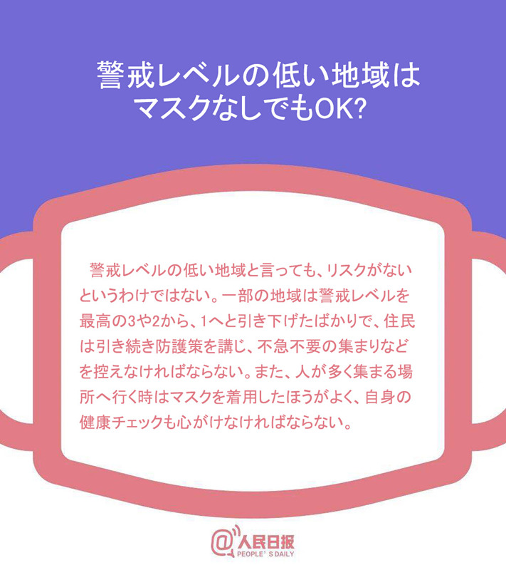 警戒レベルの低い地域と言っても、リスクがないというわけではない。一部の地域は警戒レベルを最高の3や2から、1へと引き下げたばかりで、住民は引き続き防護(hù)策を講じ、不急不要の集まりなどを控えなければならない。また、人が多く集まる場(chǎng)所へ行く時(shí)はマスクを著用したほうがよく、自身の健康チェックも心がけなければならない。