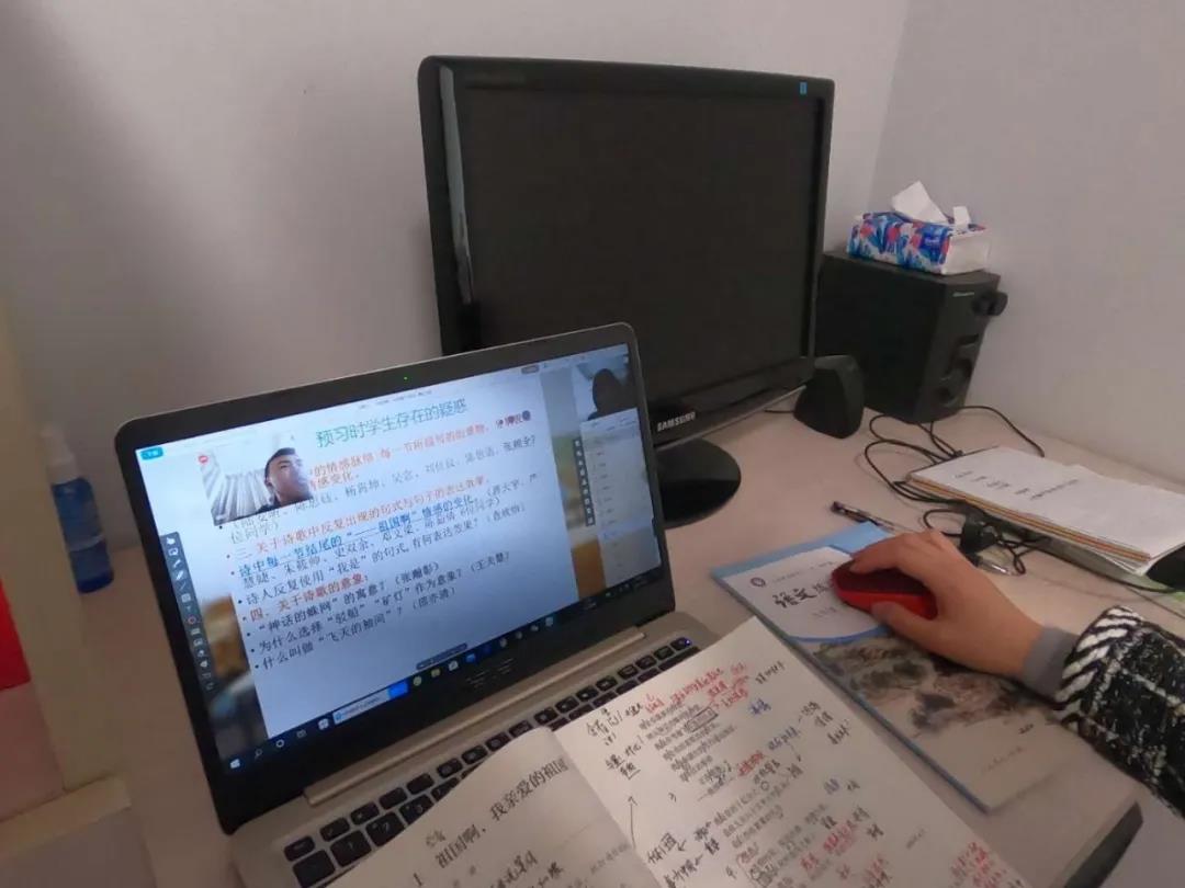 オンライン授業(yè)で生徒とやり取りする上海市建平実験中學(xué)3年の國語教師の丁鳳さん