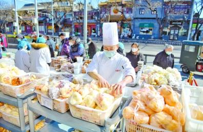 北京の多くの老舗レストランが、店に人が集まる狀況を回避する感染予防のために屋外に「転戦」し、店の外の「屋臺(tái)」で商品を販売している。3月4日、西城區(qū)の馬凱レストラン地安門店では、デリバリー用の臺(tái)が店の外に並べられ、新鮮な野菜、主食、塩漬け肉、半製品、持ち帰り用の料理などが売られていた。マスクをした近所の人が、列に並んで順番を待っていた?!副本┤請?bào)」が伝えた。(編集KS)