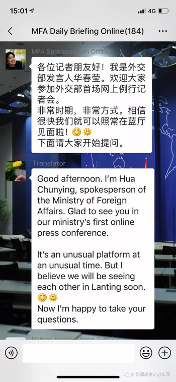 春節(jié)(舊正月、今年は1月25日)後初の外交部(外務(wù)省)の定例記者會(huì)見が3日、微信(WeChat)を通じて行われた。史上初のインターネットを通じた外交部記者會(huì)見が正式に始まった。そして、1時(shí)間5分の間に、華報(bào)道官は20の質(zhì)問に回答した。>>