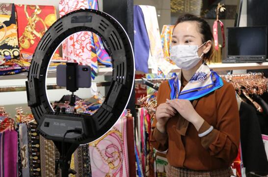 2020年3月3日、北京市の秀水街大廈は営業(yè)が再開し、一人の業(yè)者が攜帯電話のライブ配信を通じて商品を販売する様子。(撮影?劉靜。寫真提供?人民図片)