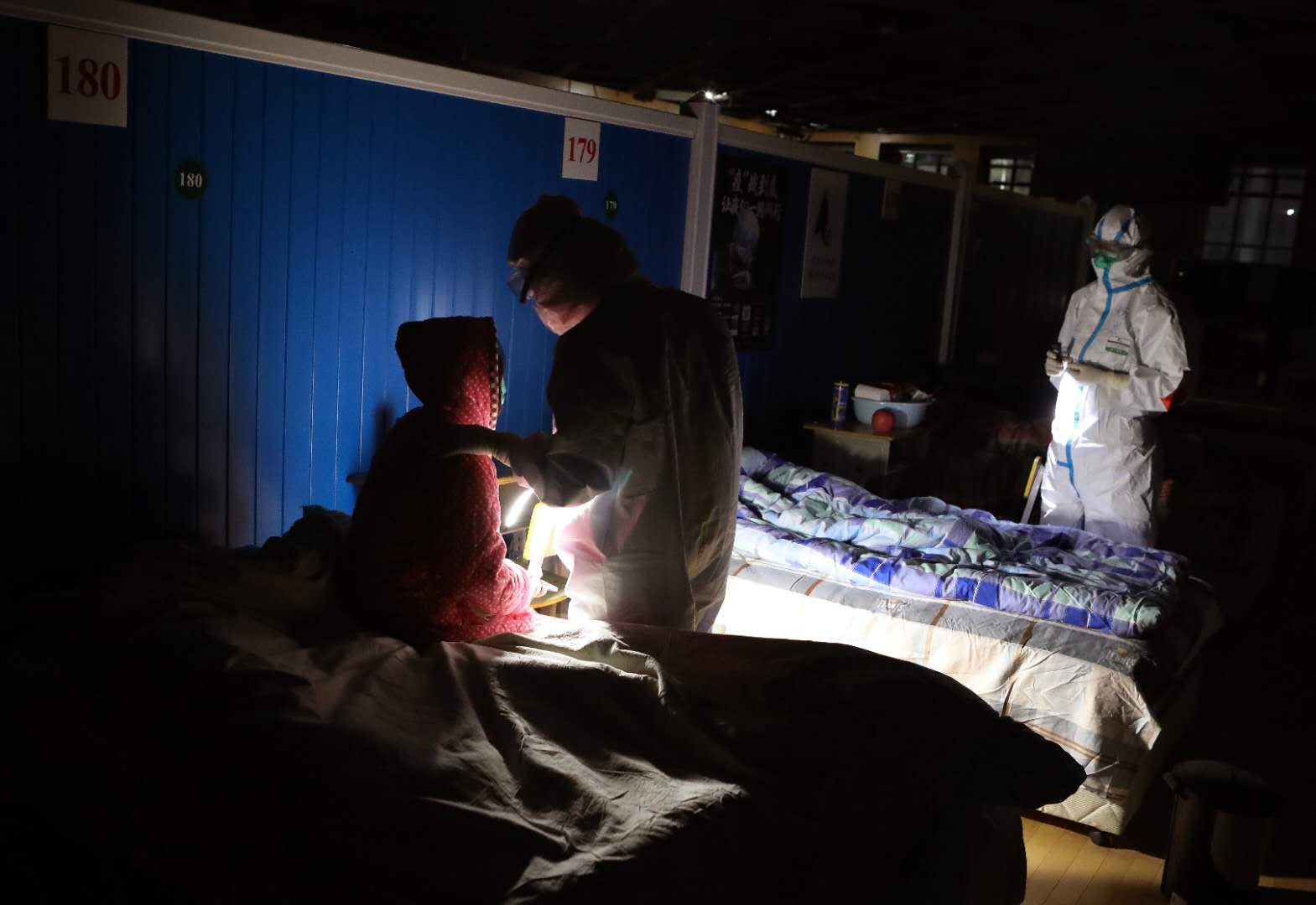 9日夜、夜の巡回時(shí)に翌日に退院する患者との別れを惜しむ武昌方艙醫(yī)院の醫(yī)療従事者。(撮影?李舸)