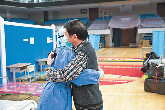10日、武昌方艙醫(yī)院が休止となり、しっかりと抱き合う患者と醫(yī)療従事者。(撮影?張武軍)
