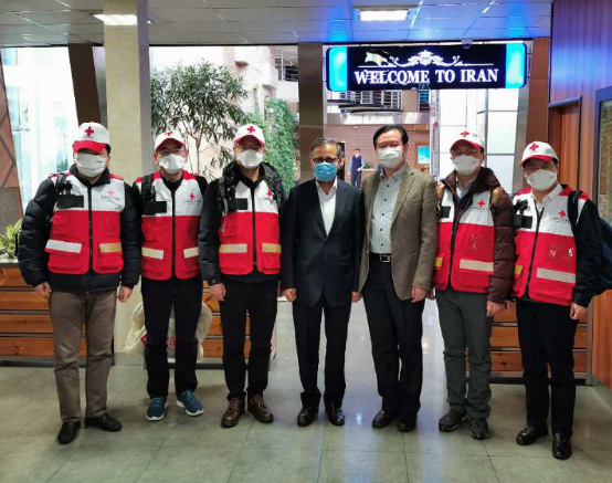 2月29日早朝、中國(guó)側(cè)が援助した醫(yī)療物資の一部を攜えてイランの首都テヘランに到著した中國(guó)赤十字ボランティア専門家チームの一行5人(寫真提供?在イラン中國(guó)大使館)。