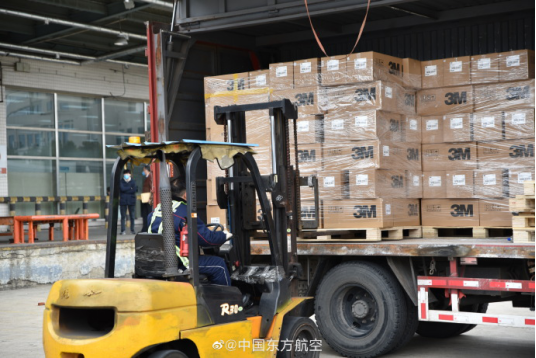 3月2日、上海市から韓國(guó)テグ市?慶尚北道に寄贈(zèng)されたマスク50萬枚。マスクを外す中國(guó)人スタッフ(寫真ソース?中國(guó)東方航空微博)。