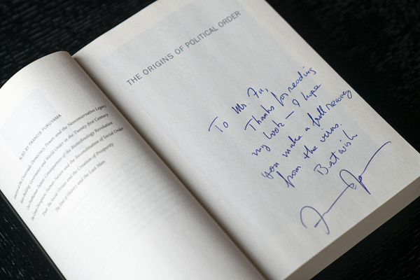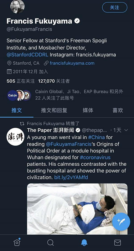 この畫像が海外に伝わると、本の筆者のフランシス?フクヤマ氏の目にも觸れ、氏は自身のSNSにこの「本を読む青年」を転載した上、サイン入りの自著を贈った。
