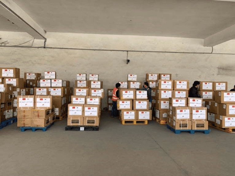 「鯨波萬(wàn)里なるも、一葦航るべし、出入相友とし、守望相助く」などの溫かいメッセージが貼られた日本向けの醫(yī)療物資(畫(huà)像は遼寧省人民政府外事弁公室が提供)