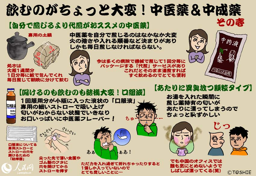 中醫(yī)薬は一般的に煎じて飲むタイプが多い。現(xiàn)在、ほとんどの病院で「代煎」という煎じ薬を作る機械で煎じる作業(yè)を代行し、しかも1回分ごとにパッケージしてくれるサービスを提供している。これだとパッケージごと湯煎すればすぐ飲むことができるのでとても便利だ。