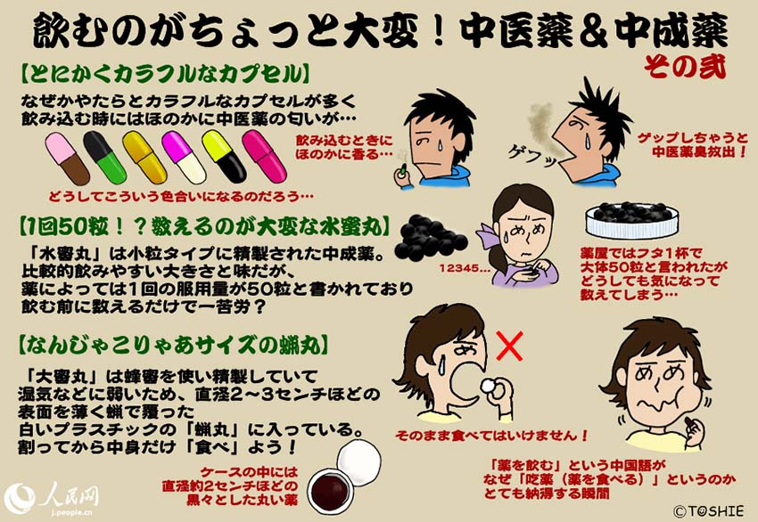 中成薬もカプセル狀にした薬などが増えているが、飲むときにほんのり、しかししっかり中醫(yī)薬の匂いがする?!缚诜骸工趣いΨN類の1回服用分が1本の小瓶に入った液狀の薬は専用の細いストローで吸い上げるのだが、これは匂いがわからない狀態(tài)でいきなり口いっぱいに中醫(yī)薬の味が広がるので、毎回飲むときにドキドキする。一番ポピュラーなのは顆粒になっていてお湯で溶かすタイプ。しかしこれもお湯を入れた瞬間に煎じ薬特有の匂いがあたりに漂うので、オフィスなどで誰かが飲んでいるとすぐわかる。そして初めて見たとき一番驚いたのが「蝋丸」。直徑2~3センチほどの表面を薄く蝋で覆った白いプラスチックの丸いケースに入っているのだが、初めて見たときはそれがケースとわからず、とても飲み込めない!と目が點になった。ようやく試行錯誤してケースを半分に割ると、中から出てきたのは直徑約2センチほどの黒々とした丸い薬。やっぱりこのままではとても飲み込めないサイズだ。最終的にちぎったり、噛んだりしながら飲み込めばいいということを教えられたが、「薬を飲む」という中國語がなぜ「吃薬(薬を食べる)」というのか、とても納得した瞬間だった。
