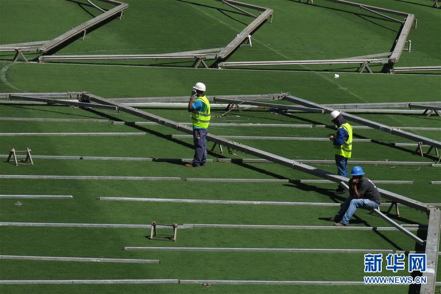 23日、ブラジル?サンパウロのパカエンブースタジアム內(nèi)で臨時醫(yī)療施設(shè)を建設(shè)する作業(yè)員。