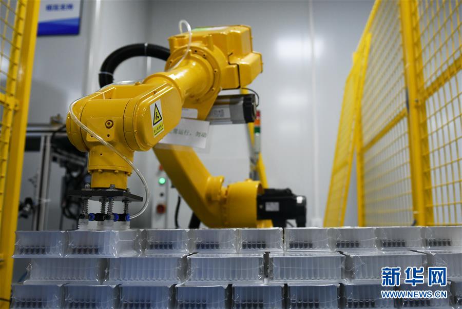 西安天隆科技有限公司の生産現(xiàn)場(chǎng)で、ロボットアームが半製品試薬キットを整理する様子