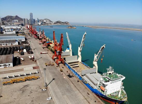 2020年3月19日、ドローンで撮影した江蘇省の連雲(yún)港ふ頭での貨物積み卸しのにぎやかな様子。(撮影?王春。寫真提供は人民図片)