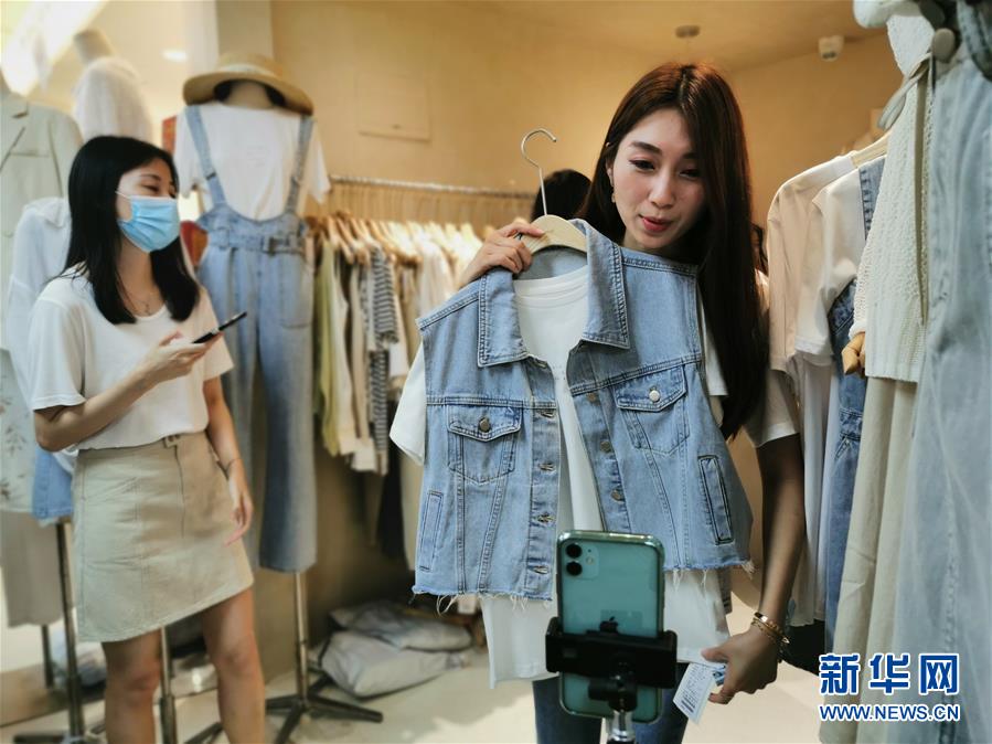 広東省広州市の新中國大廈(ビル)で、アパレル店舗の店員が攜帯電話でライブ配信をする様子。(3月21日、撮影?胡林果)
