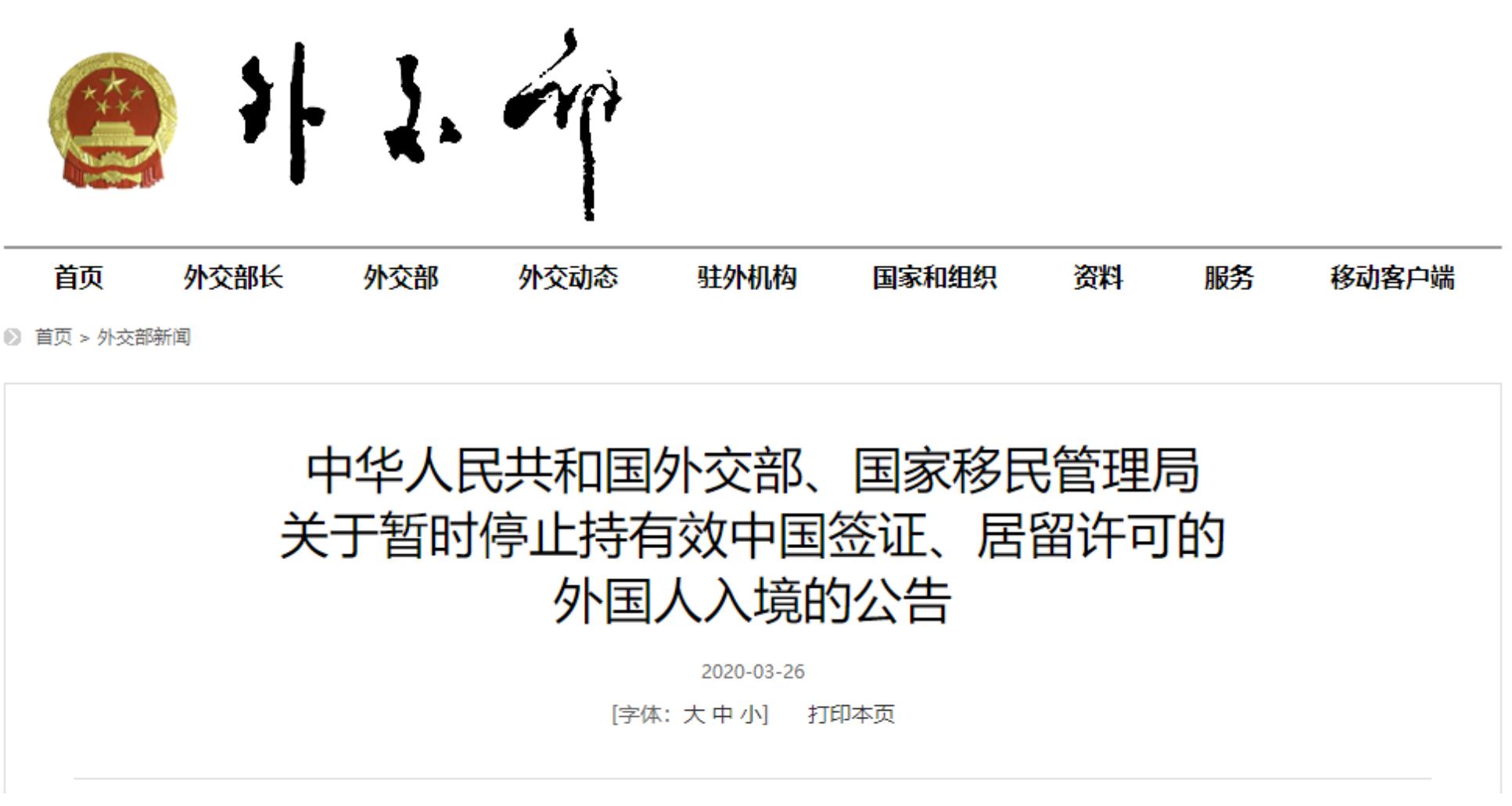 新型コロナウイルス感染による肺炎が世界範(fàn)囲で急速に蔓延していることに鑑み、中國(guó)は2020年3月28日0時(shí)から、現(xiàn)在有効な訪中ビザ(査証)及び居留許可を有する外國(guó)人の入境を暫定的に停止することを決定した。APECビジネス?トラベル?カードを有する外國(guó)人の入境も暫定的に停止する。寄港地ビザ、24/72/144時(shí)間のトランジットビザ免除、海南入境ビザ免除、上海クルーズ船ビザ免除、香港?澳門(マカオ)地區(qū)の外國(guó)人が団體で広東省から入境する際の144時(shí)間ビザ免除、ASEANからの団體旅行者が広西壯(チワン)族自治區(qū)から入境する際のビザ免除などの政策を暫定的に停止することを決定した。外交、公務(wù)、禮遇、C(乗務(wù)員)ビザでの入境は影響を受けない。外國(guó)人が訪中して必要な経済貿(mào)易や科學(xué)技術(shù)などの活動(dòng)に従事する場(chǎng)合や、緊急の人道主義的な必要がある場(chǎng)合は、中國(guó)の在外公館にビザを申請(qǐng)することができる。この公告の後に発給されるビザを有する外國(guó)人の入境は影響を受けない。