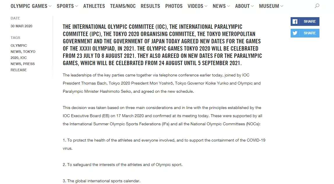國(guó)際オリンピック委員會(huì)(IOC)と東京五輪組織委は30日、新型コロナウイルス感染拡大により2021年へ延期された東京五輪の新たな日程を発表し、來(lái)年7月23日に開(kāi)會(huì)式、8月8日に閉會(huì)式を行うと明らかにした。パラリンピックは8月24日に開(kāi)幕し、9月5日に閉幕する。ちょうど1年のスライド開(kāi)催で、「東京2020年オリンピック?パラリンピック」の名稱もそのまま使う。人民網(wǎng)が各社の報(bào)道をまとめて報(bào)じた。