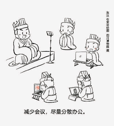 はじける笑顔の撃鼓説唱俑が持っているマレットは體溫計(jì)に変えられ、スマホを三腳に取り付けて儒教の経典「六経」の説明をする教師の前では、學(xué)生がノートパソコンを開(kāi)いて座り、オンライン授業(yè)を受けているというように、これらの文化財(cái)や古代の人々が描かれている「出勤再開(kāi)時(shí)の防護(hù)ガイド」と題するシリーズイラストが話題となっている。イラストの作者である文化財(cái)の撮影を?qū)熼Tとする寫真家?趙震さんは、こうしたイラストで出勤が再開(kāi)した後も新型コロナウイルス感染防止対策を忘れないよう注意を促している。人民日?qǐng)?bào)海外版が報(bào)じた。