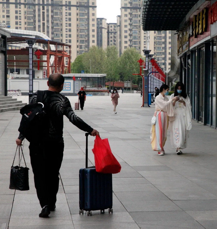 4月8日、武漢駅で、改札口に向かう、東莞虎門に赴く一家(撮影?中國(guó)撮影家協(xié)會(huì)/柴選)。