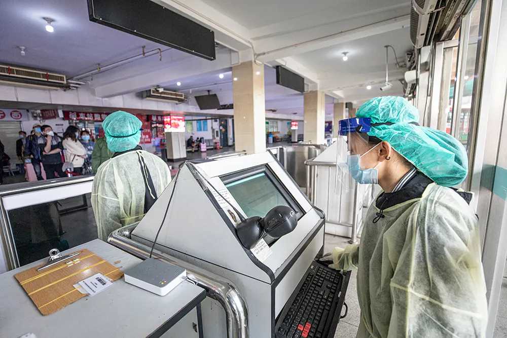 防護(hù)服を著用して業(yè)務(wù)にあたる武昌付家坂長(zhǎng)距離バスターミナルの検札係(撮影?中國撮影家協(xié)會(huì)/陳黎明)。