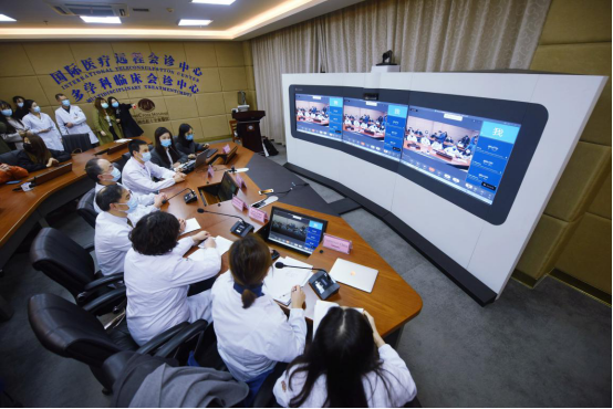 4月3日、杭州市赤十字會(huì)病院遠(yuǎn)隔立ち?xí)ぴ\察センターで、新型コロナウイルス肺炎の治療?防疫プランについて意見交換する中國(guó)の醫(yī)療専門家とメキシコの醫(yī)療専門家(撮影?龍巍/人民図片)。