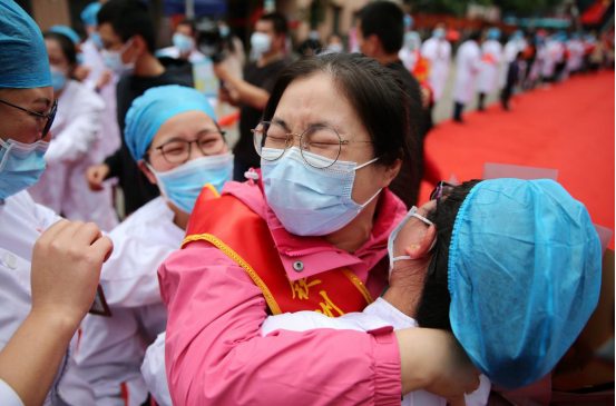 4月14日、広西壯(チワン)族自治區(qū)欽州市第二人民病院で、欽州に戻った後に出迎えた同僚と抱き合う湖北省支援醫(yī)療チームのメンバー(撮影?曾開宏/人民図片)。