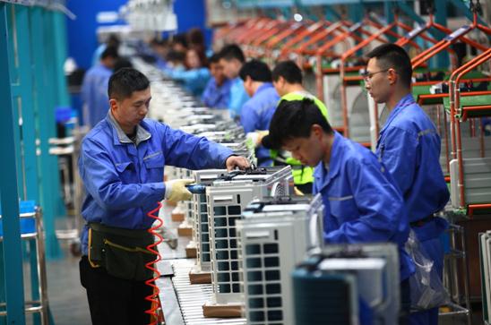 4月10日、安徽當(dāng)塗経済開発區(qū)にある奧克斯集団の生産拠點(diǎn)で、従業(yè)員がエアコンを急ピッチで製造する様子。(撮影?王文生。寫真提供は人民図片)