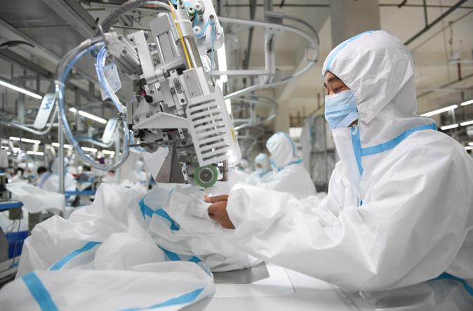 (中)在湖北省裕民防護(hù)用品有限公司生產(chǎn)車間,工人們有序分排而坐,每個人都忙著手里的防護(hù)布料縫紉加工。