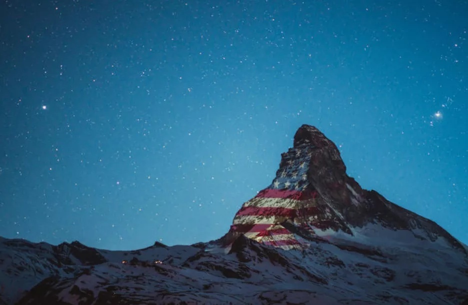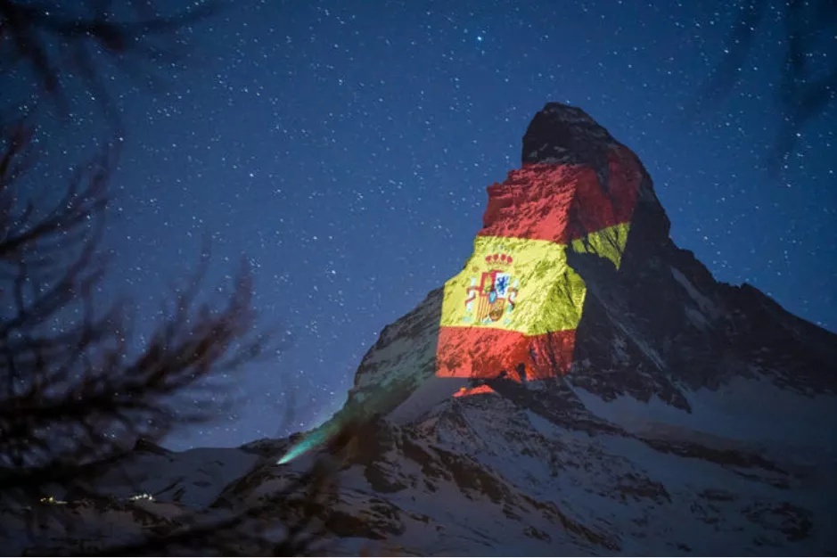 マッターホルン山頂には、中國の五星紅旗のほか、感染拡大が深刻な國家の國旗が映し出され、「希望と力」が伝えられている。