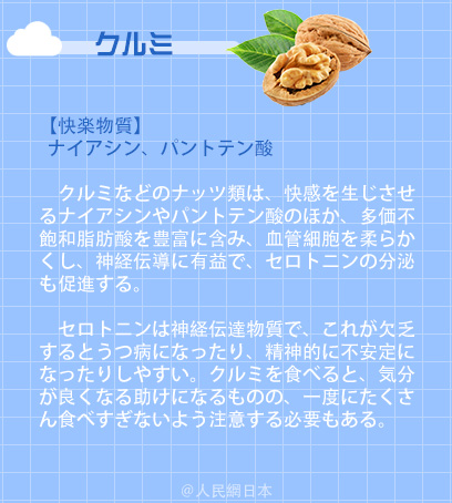 クルミなどのナッツ類は、快感を生じさせるナイアシンやパントテン酸のほか、多価不飽和脂肪酸を豊富に含み、血管細(xì)胞を柔らかくし、神経伝導(dǎo)に有益で、セロトニンの分泌も促進(jìn)する。