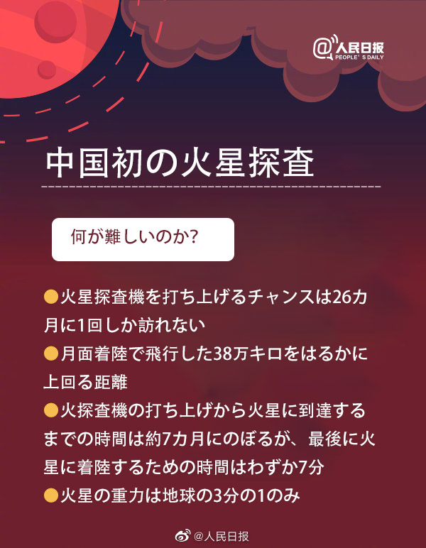 専門家によると、中國初の火星探査任務(wù)はプロセスが複雑で、技術(shù)的に大きな飛躍があり、カギとなる段階が多く、大きなチャレンジとなる。例えば制御通信の面では、月面著陸で飛行した38萬キロをはるかに上回る距離が、宇宙船の制御通信にとって大きな試練となる。さらに例えば安全な著陸については、探査機(jī)の打ち上げから火星に到達(dá)するまでの時(shí)間は約7カ月にのぼるが、最後に火星に著陸するための時(shí)間はわずか7分だ。地球の自然環(huán)境と比べると、火星の重力は地球の3分の1のみだ。これらは安全な著陸の難點(diǎn)?チャレンジとなる。(編集YF)