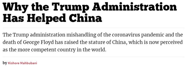 シンガポールのKishore Mahbubani元國連大使はこのほど米外交専門誌「ナショナル?インタレスト」への寄稿で「トランプ政権には熟考した包括的で長期的な対中戦略がない。問題を処理する能力と強大な精神力があるとのイメージを米國は確立できていない。新型コロナウイルスの感染拡大とフロイド事件の発生後に米國が世界の人々に與えた印象は、その正反対だ。比べてみると、トランプ政権は中國の地位を高めた?,F(xiàn)在中國は世界において、より能力のある國だとされている」と指摘した。