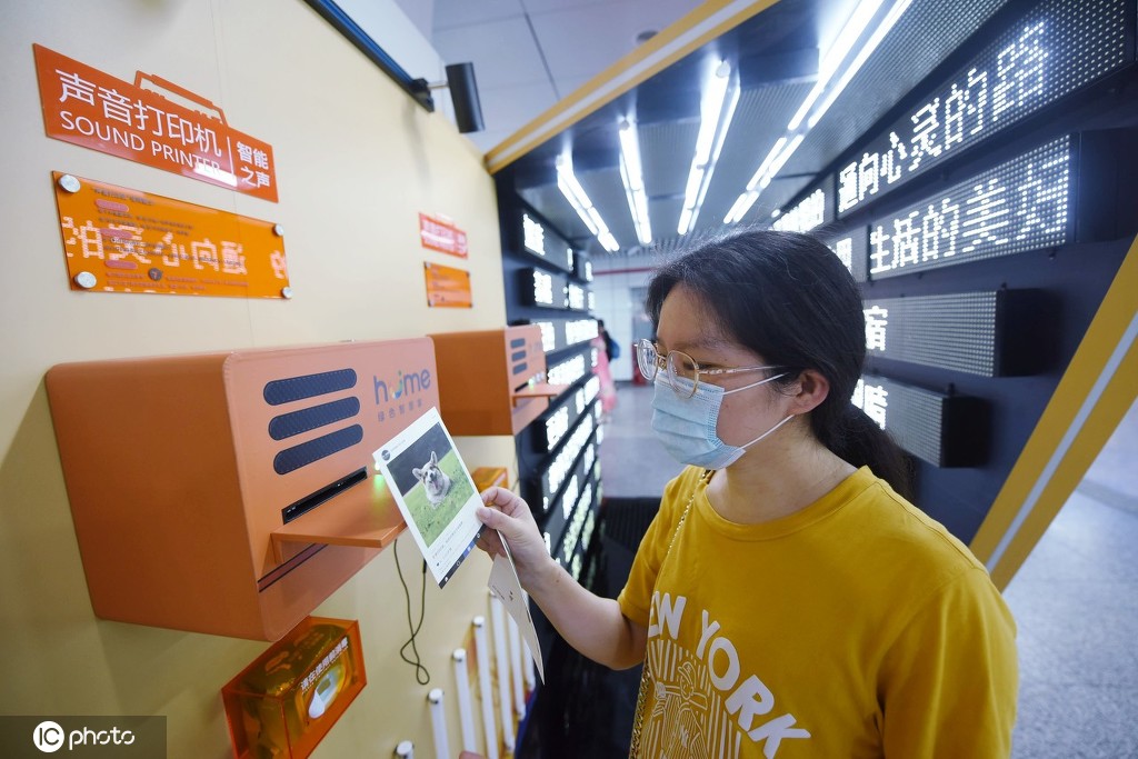 6月15日、杭州市のある地下鉄駅で「サウンドプリンター」がプリントした「音」のカードを受け取る體験者(寫真著作権は東方ICが所有のため転載禁止)。
