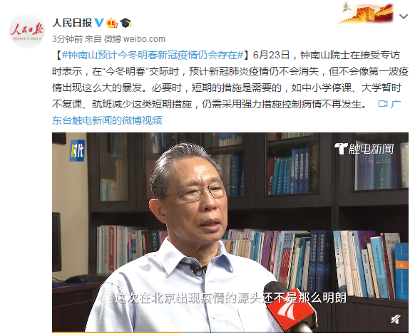 中國の呼吸器疾患の専門家である鍾南山院士は今月23日、取材に対して、「今年の冬から來年の春にかけても、新型コロナウイルス感染癥が収束することはないが、第一波ほど爆発的に感染が拡大することはないだろう」との見通しを語った。人民日報(bào)が報(bào)じた。