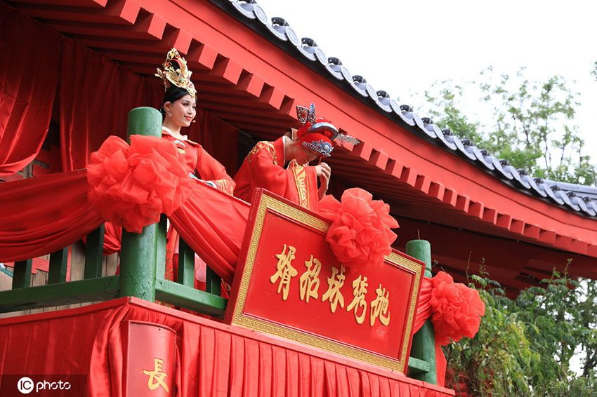 陝西省西安市郊外にある西安世博園で、伝統(tǒng)的な婿選びの風(fēng)習(xí)を再現(xiàn)するイベントが行われ、訪れた人々の注目を集めていた。建物の2階から伝統(tǒng)的な花嫁衣裝を身につけた女性パフォーマーが繍球(刺繍を施したまり)を下に向かって投げ、そのまりをキャッチした男性は婿になることができる。見事まりをキャッチした観客のある男性は、舞臺(tái)に上がり、この特別に再現(xiàn)された古代の婚禮を體験した。(編集KN)