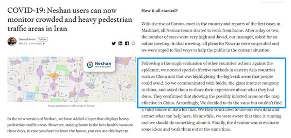 中國(guó)の感染拡大防止対策の経験は、他の國(guó)に參考を提供している。3月30日、イランで最も人気があり、400萬人以上がインストールしている地図で、地域 (ローカル) 検索サービス?Neshan Mapsは、「Neshanのユーザーは、人の密度が示されているヒートマップを見ることで、人が密集している場(chǎng)所に行ったり、通ったりすることを避けることができる」という文章を発表した。また、Neshan Mapsが、新型コロナウイルス感染拡大に関するアイデアをいかに実行に移したかについて、チームは、「他の國(guó)がどのような対策をしているかを初めに評(píng)価した際、中國(guó)などの東アジア諸國(guó)が、避けたほうがいいハイリスク地域を地図上に目立つように表示するという特に効果的な方法を採(cǎi)用していることを発見した。そのため、百度と連絡(luò)を取って、経験を共有してもらい、イランの人々に対し、科學(xué)的に防止対策を講じ、安全に外出できるための參考情報(bào)を提供できるようになった」と説明した。