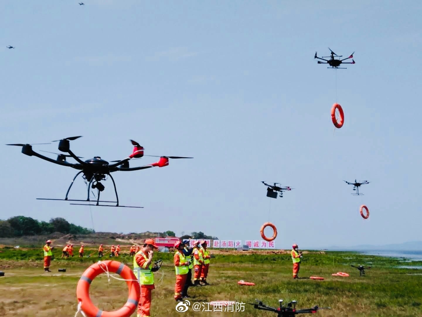 救命器具を投下するドローン。(ソース:江西省消防救援総隊)