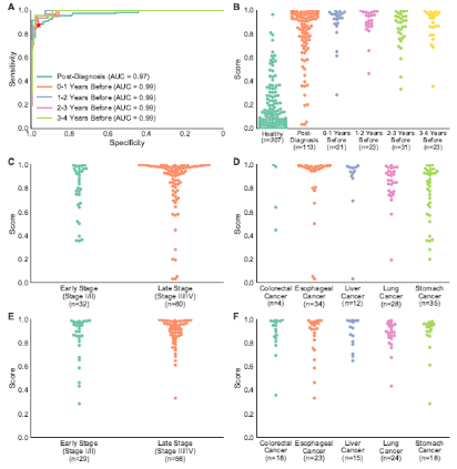 研究の結(jié)果、結(jié)腸がん、直腸がん、食道がん、肝臓がん、肺がん、胃がんというよくみられる5種類のがんに対するこの技術(shù)の検査の感度が、がんと診斷される前のさまざまな時(shí)期に採取した血液サンプルと似ていることがわかった。ここから、がんのシグナルは病狀が発展する初期、さらには自覚癥狀がない診斷の數(shù)年前にはすでに血液中に存在していることを明らかにしている。