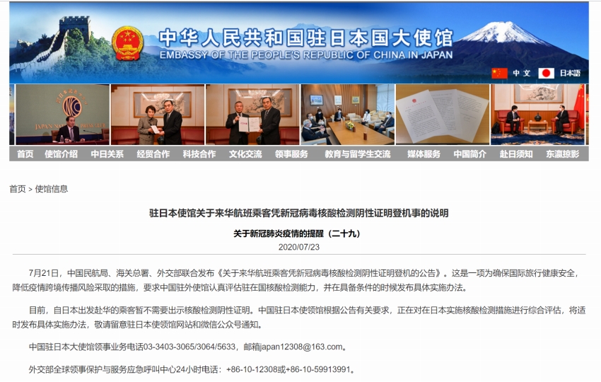 在日本中國(guó)大使館は7月23日、「中國(guó)民用航空局、稅関総署、外交部(外務(wù)?。─?月21日、『中國(guó)への航空便乗客の新型コロナウイルスPCR検査陰性証明による搭乗に関する公告』(公告)を共同で発表した。これは、國(guó)際的な移動(dòng)の際の健康と安全を確保し、感染癥の國(guó)境を跨いだ伝播リスクを低減するための措置で、中國(guó)の在外公館に対し、當(dāng)該國(guó)のPCR検査能力をしっかりと評(píng)価し、當(dāng)該國(guó)が條件を備えている場(chǎng)合は具體的な実施方法を公表するよう求めている」という情報(bào)を発信した。
