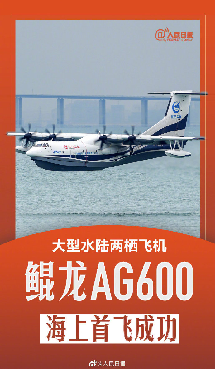 大型水陸両用機(jī)のAG600、海上初飛行に成功